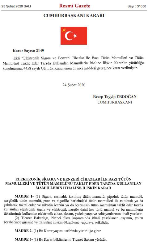 Resmi Gazete'de yayımlanan Cumhurbaşkanı Kararında, "Sigara, sarmalık kıyılmış tütün mamulü, pipoluk tütün mamülü, yakılarak tüketilenler ve nikotin içersin ya da içermesin tütün mamulünü taklit eder tarzda kullanılan elektronik sigara ve elektronik nargile dahil her türlü mamul ve bu mamullerin tüketiminde kullanılan elektronik cihaz, aksam, yedek parça ve solüsyonların ithali yasaktır. Ticaret Bakanlığı, birinci fıkra kapsamında ithali yasaklanan eşyanın yolcu beraberinde girişine ve transitine ilişkin düzenleme yapmaya yetkilidir" ifadeleri yer aldı.